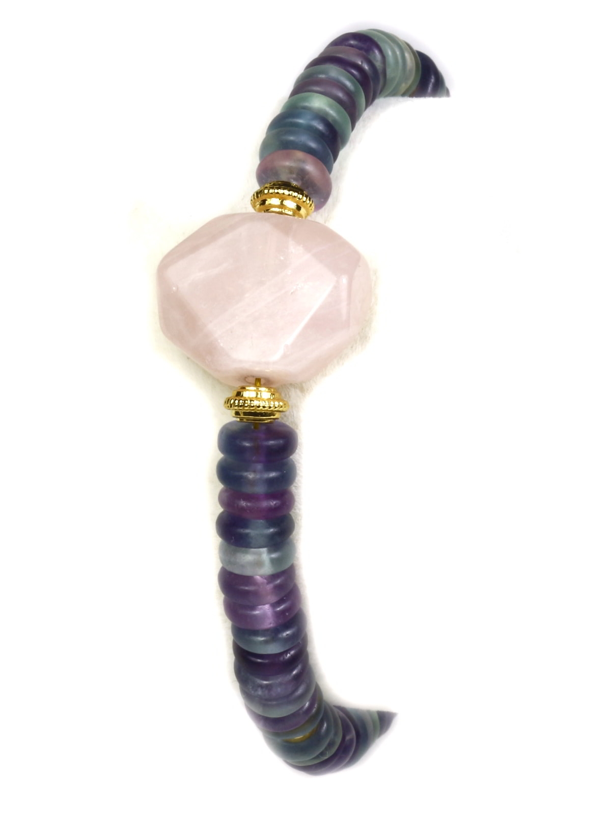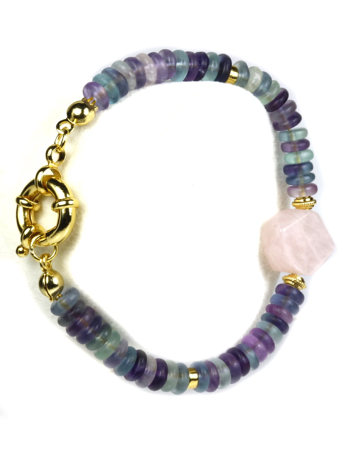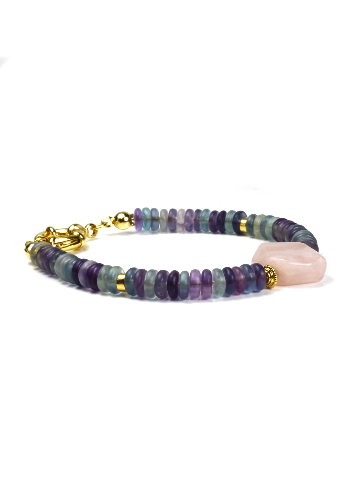 Merkezde yer alan pembe kuvars taşı, sevgi ve huzur enerjisini bileğine taşır.