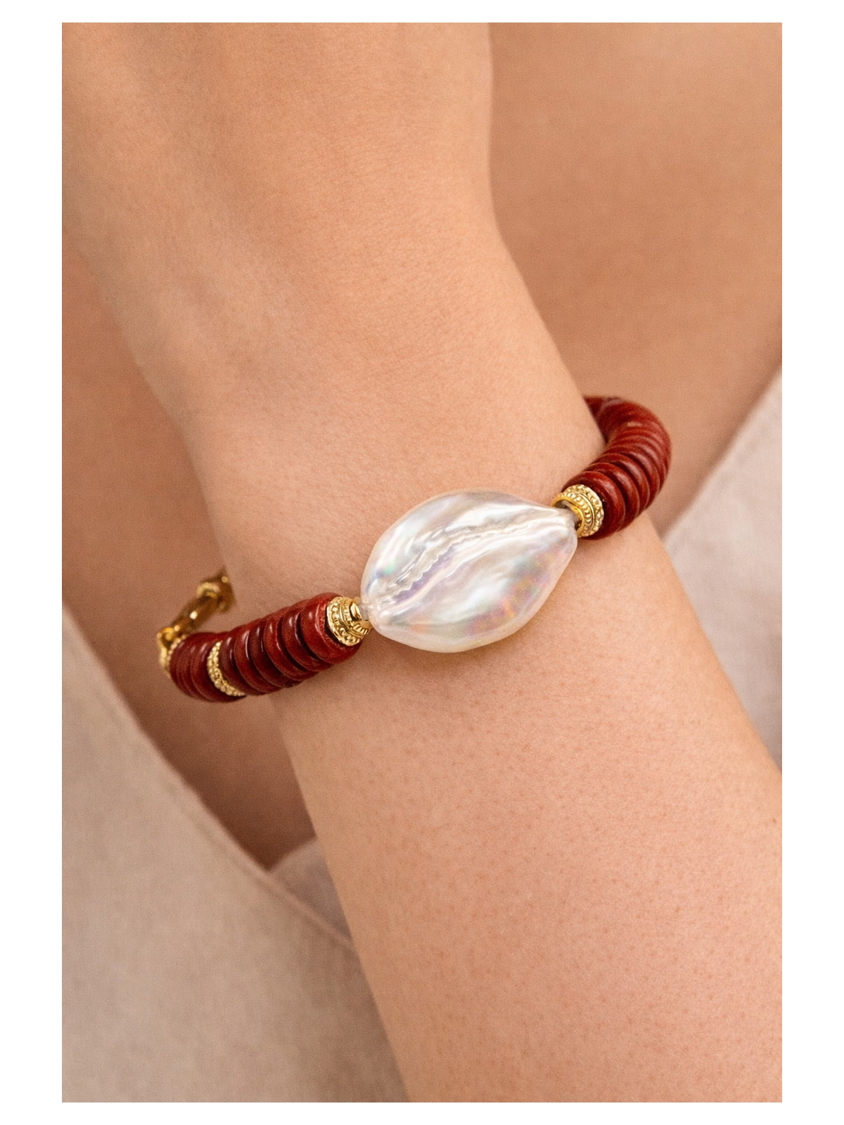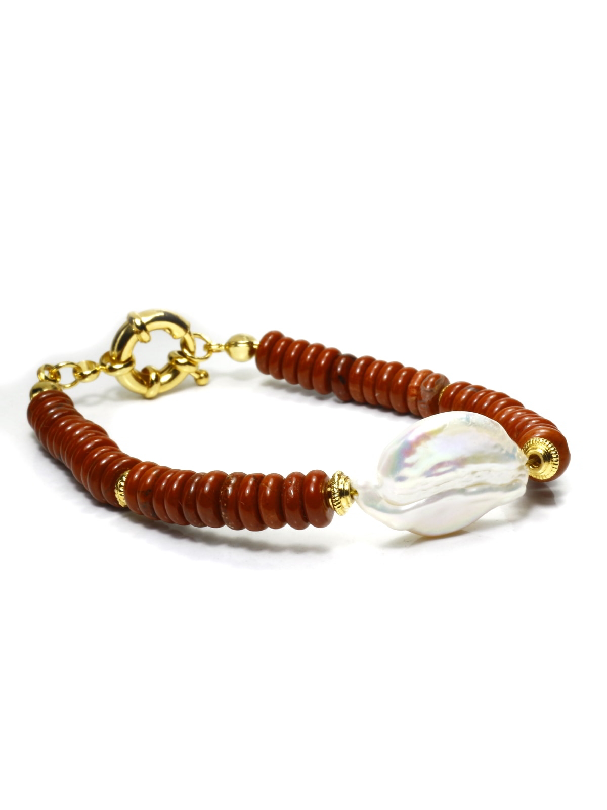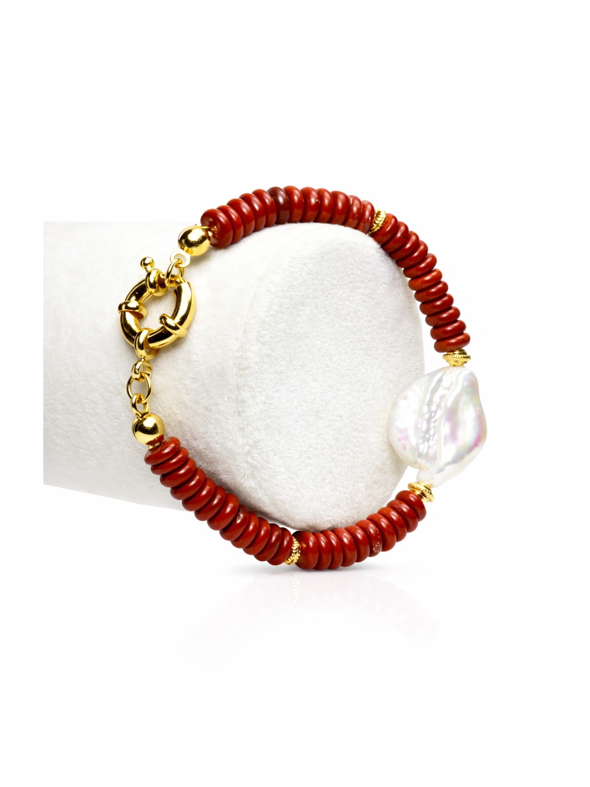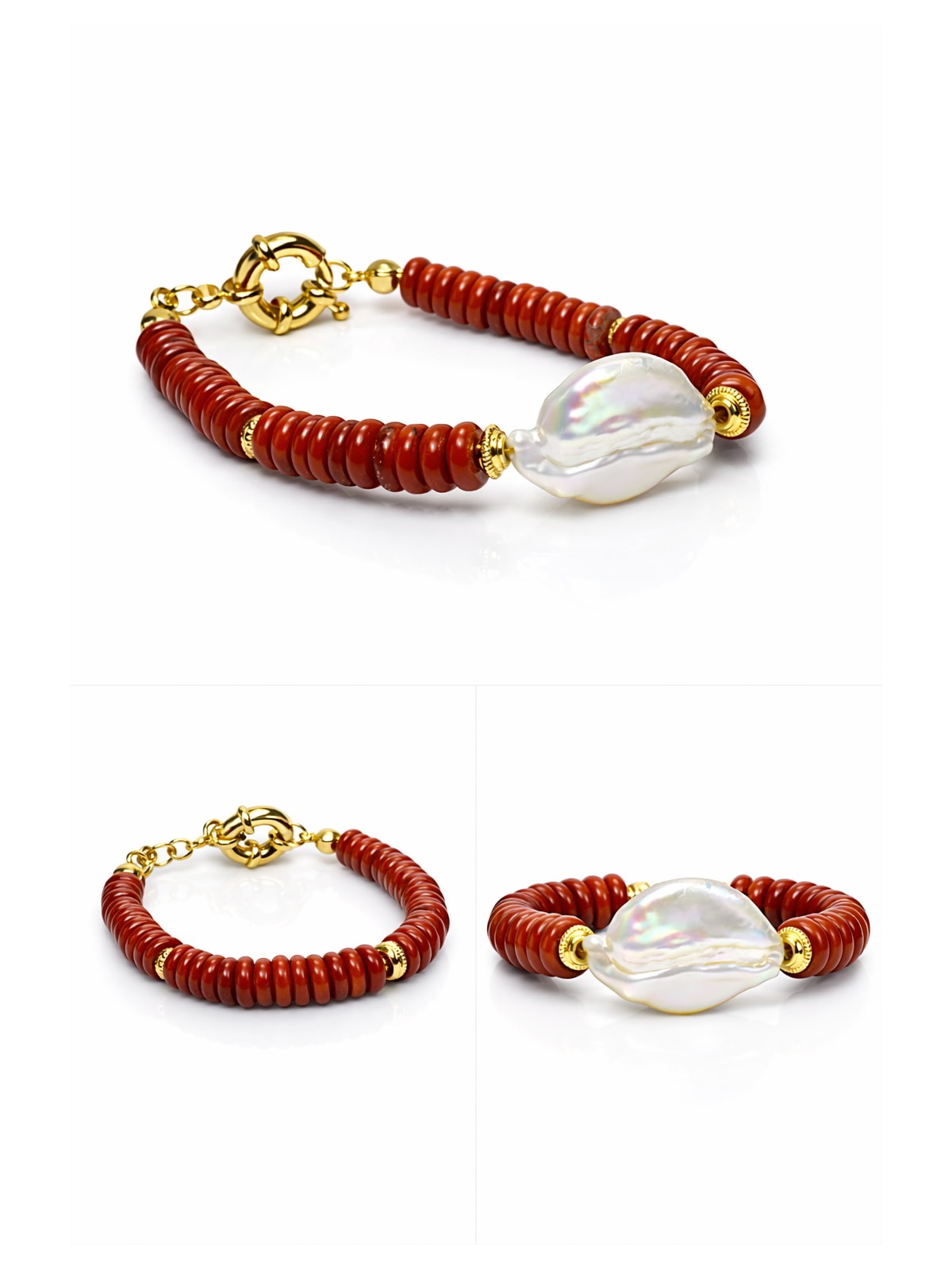 Bu özel tasarım bileklik, doğal kırmızı jasper taşı ve orijinal barok incinin büyüleyici birleşiminden doğdu. Kırmızı jasper, yeryüzünün sıcak tonlarını yansıtırken içsel denge, kararlılık ve güven hissini güçlendirir. Her bir taş doğanın benzersiz dokunuşunu taşır; tıpkı sizin gibi, hiçbir parça bir diğerine benzemez.