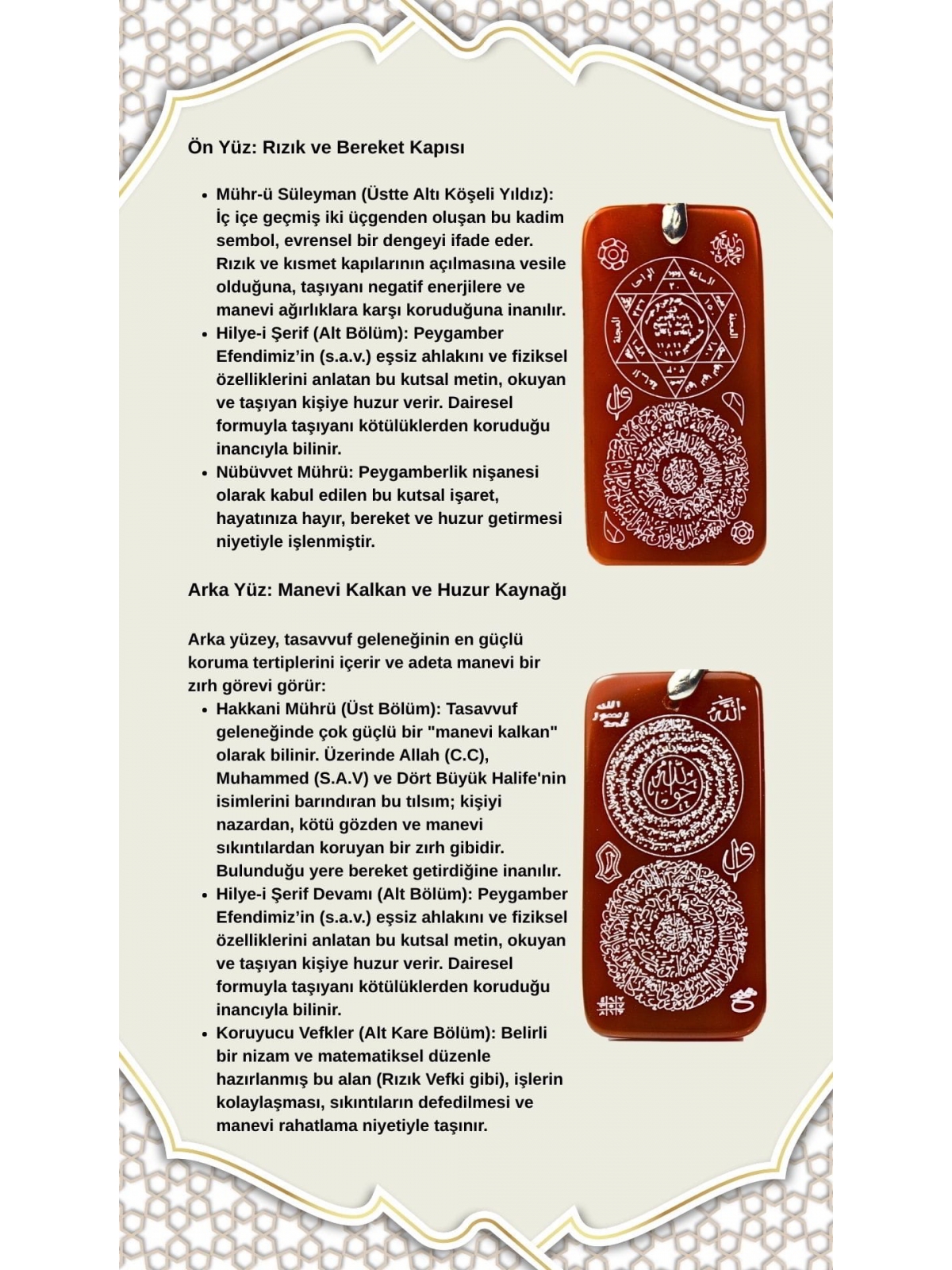 Vefk ve Kare Formlar (Alt Köşe Bölüm): Belirli bir matematiksel düzenle yazılmış duaları ve Allah'ın isimlerini içerir (Hakkani Mührü veya Rızık Vefki gibi). Sıkıntıların defi ve işlerin kolaylaşması niyetine taşınır.