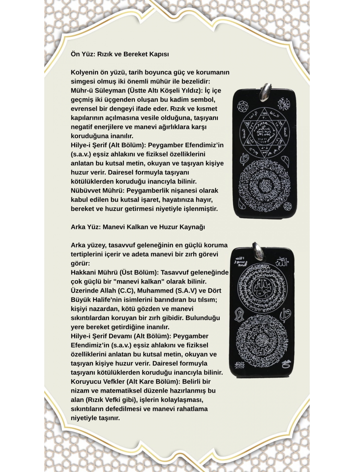 Hilye-i Şerif Devamı (Alt Bölüm): Peygamber Efendimiz’in (s.a.v.) eşsiz ahlakını ve fiziksel özelliklerini anlatan bu kutsal metin, okuyan ve taşıyan kişiye huzur verir. Dairesel formuyla taşıyanı kötülüklerden koruduğu inancıyla bilinir.
