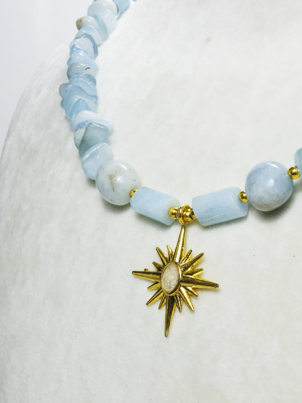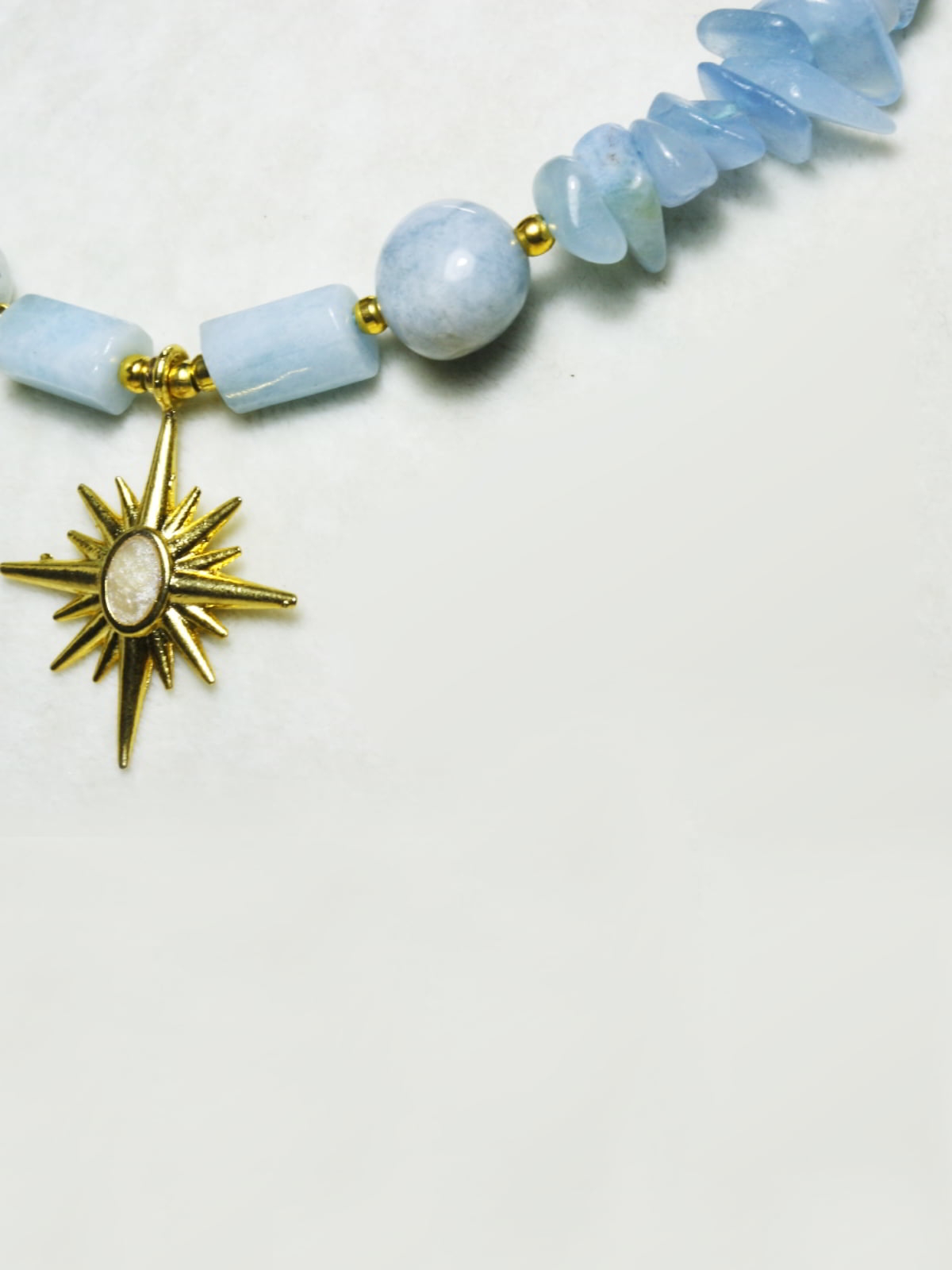 Denizlerin huzurunu ve gökyüzünün yol gösterici ışığını bir araya getiren bu kolye, hem estetik hem de ruhsal anlam taşıyan özel bir tasarımdır.