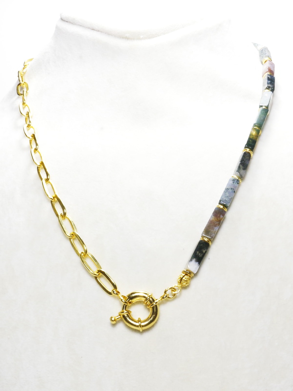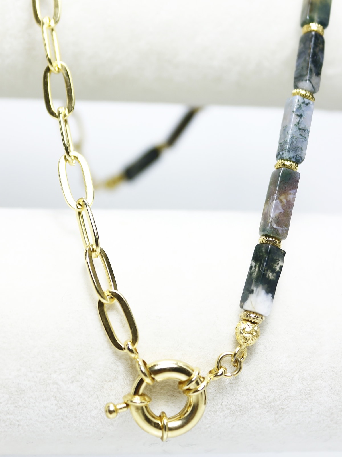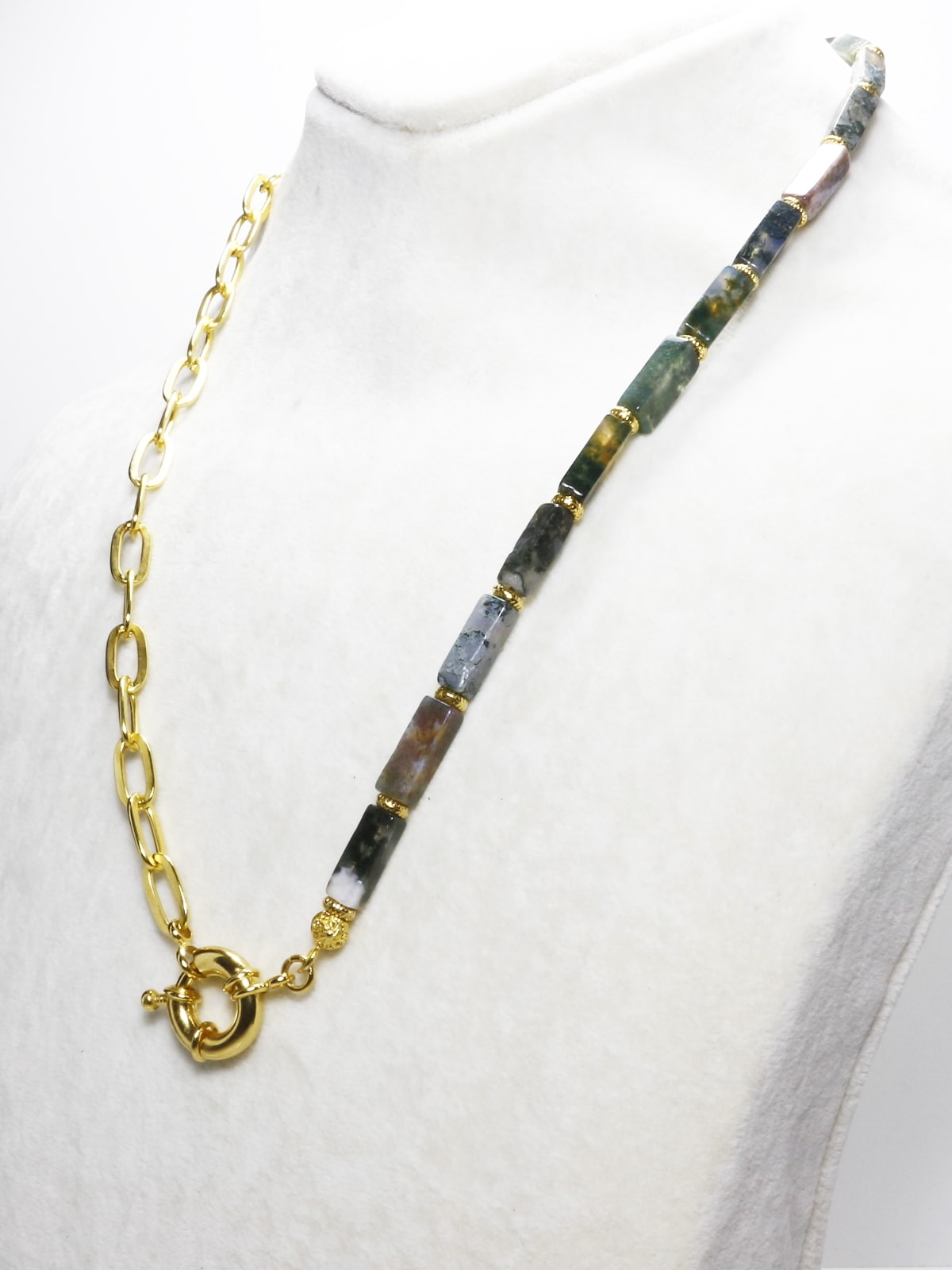 Bu eşsiz kolyenin yarısı güçlü ve karakterli gold zincir, diğer yarısı ise doğallığın simgesi Yosunlu Akik Taşı dikdörtgen prizma taşlarla bezeli. Bu denge, ruhunuzu ve tarzınızı aynı anda yansıtır.