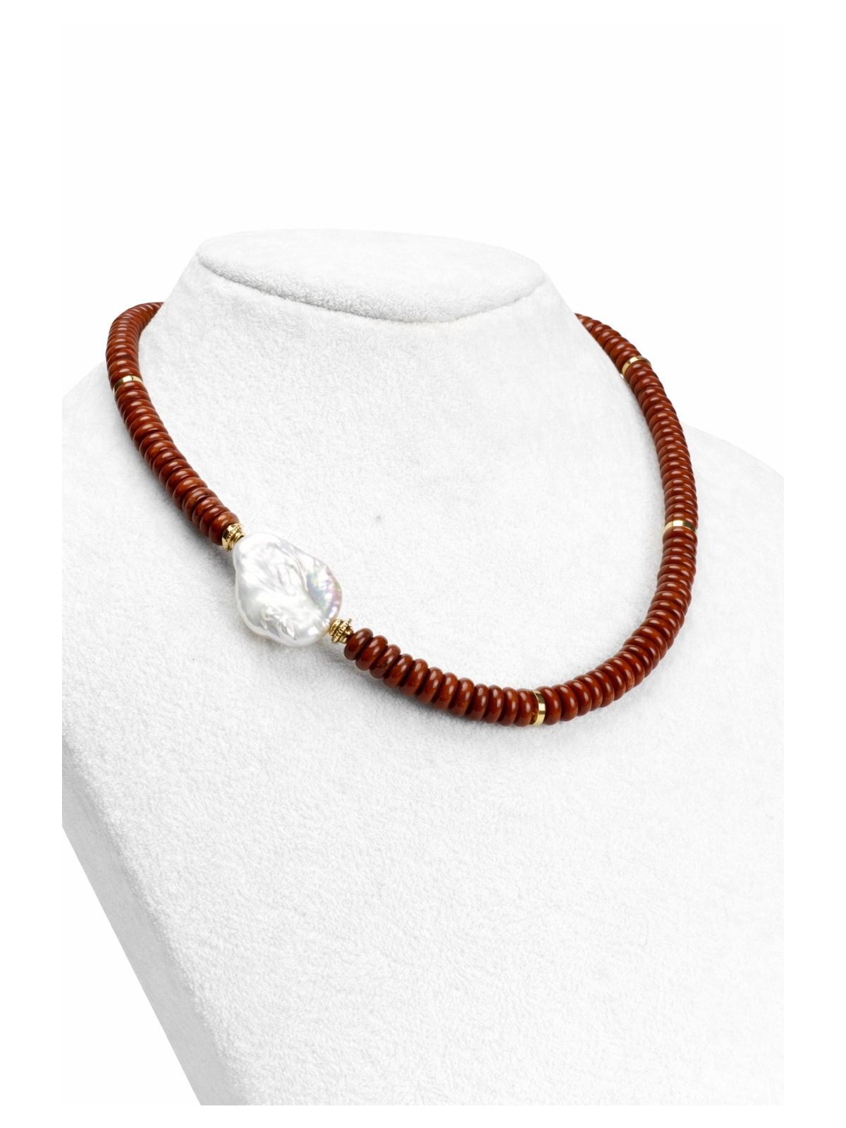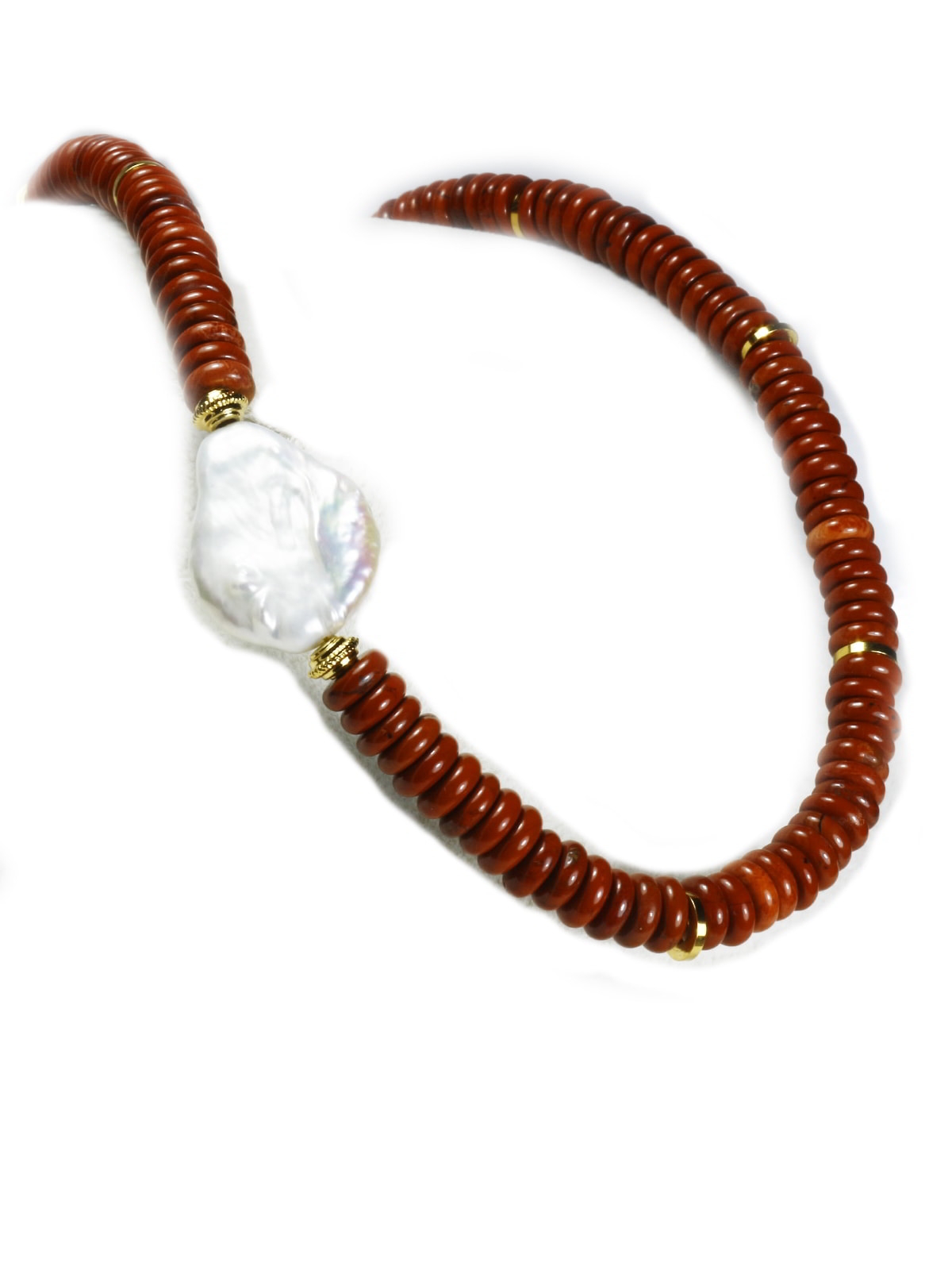 Bu özel tasarım Kırmızı Jasper & Barok İnci Doğal Taş Kolye, doğanın enerjisini altın zarafetiyle birleştiren, her detayıyla eşsiz bir tasarım harikası.