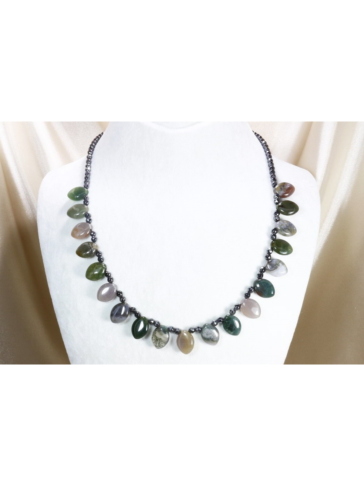 Damla Kesim Yosunlu Akik ebatları 1,5 x 1,1 cm / Kolye toplam uzunluk 50 cm'dir.